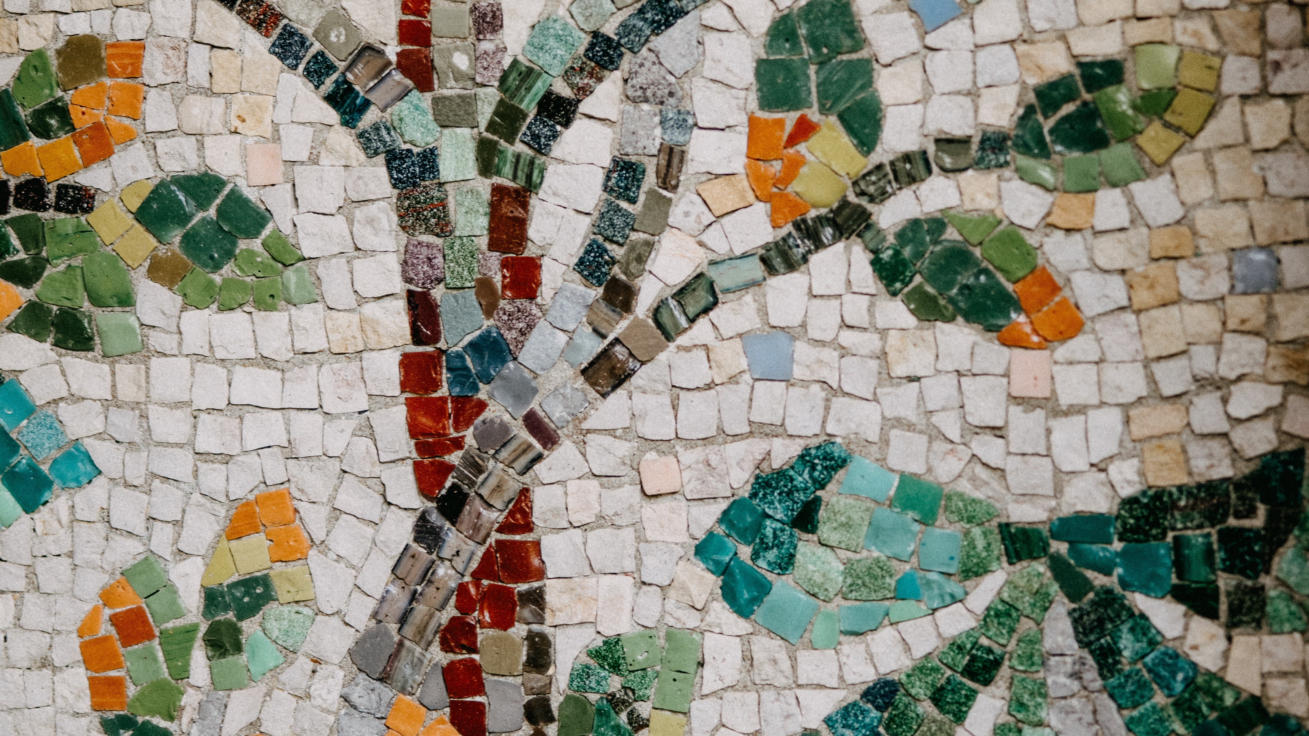Close up of Colorful Mosaic of tiles depicting flowers and leaves.